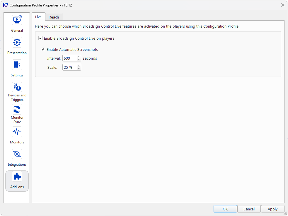 - Enable Broadsign Control Live on players – Select to enable Broadsign Control Live on all players associated with this configuration.