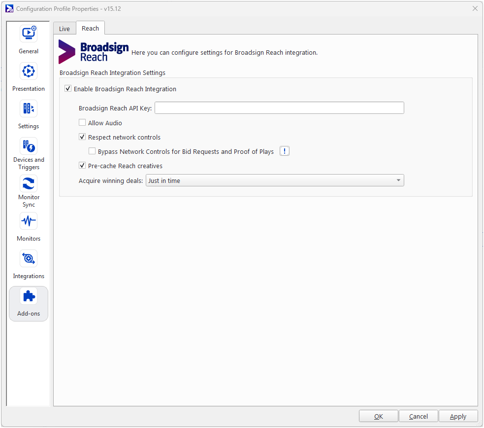 - Broadsign Reach API Key – Insert the API key you obtained from the Broadsign Reach interface. See Broadsign Reach.