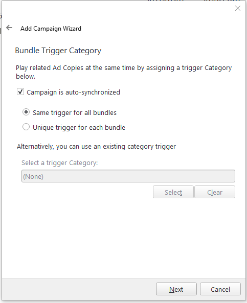 Note: The Auto-synchronize bundles option can be found in the campaign's Trigger tab under the Media section (The Trigger Tab), as well as the bundle's Trigger tab under the Categories section (The Categories Section).
