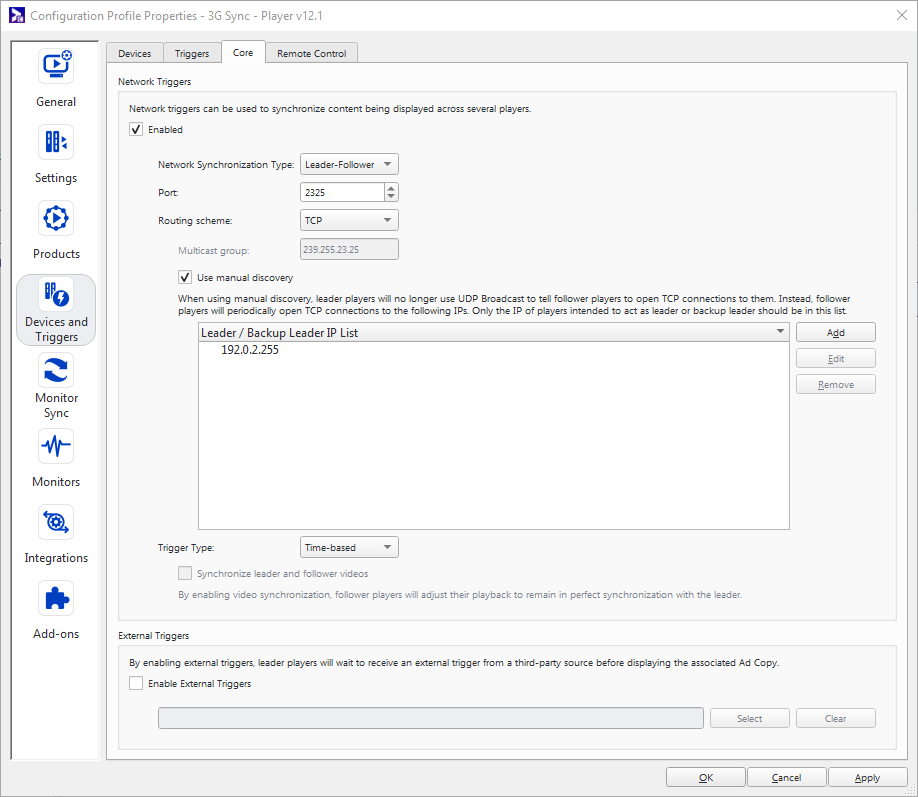 Leader/Backup Leader IP List – Appears when you select Manual Discovery. Click Add, and enter the IP address of the Leader or backup Leaders in your 3G sync network.