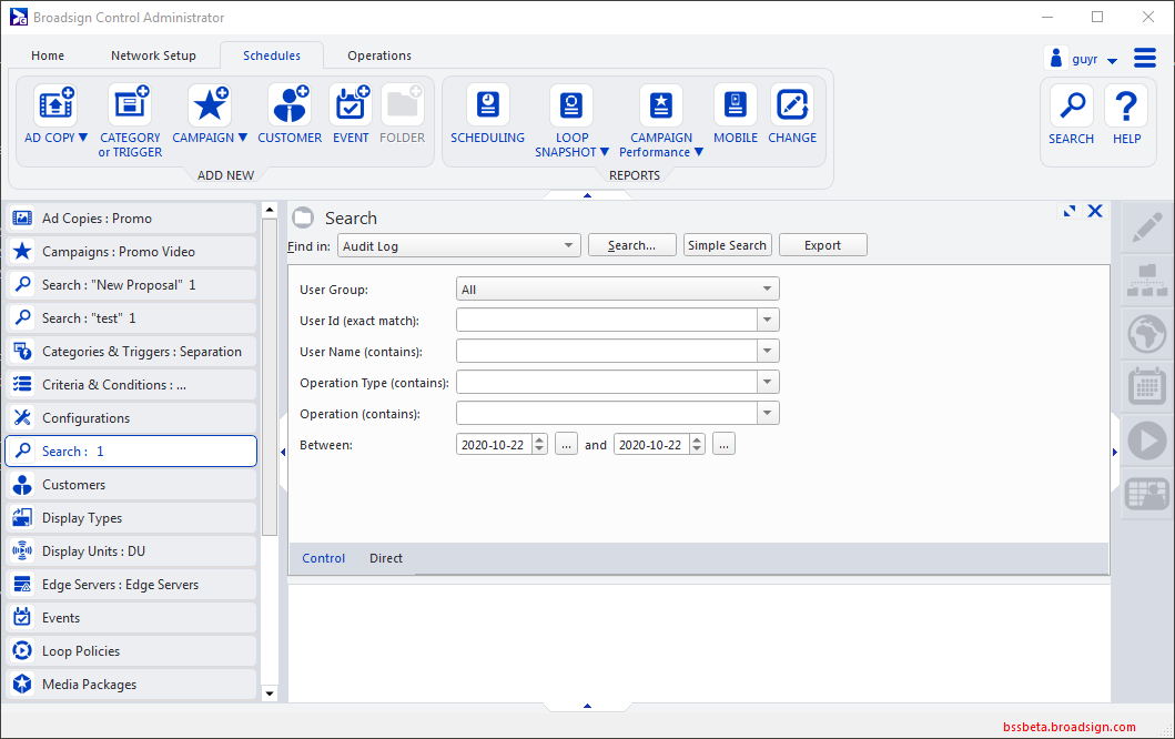 Broadsign Control Administrator offers the possibility to search audit logs (also called audit trail) for user activity that is logged by Broadsign Server.
