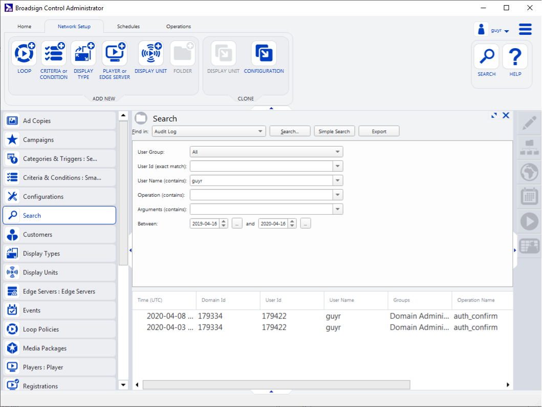 Note: 60 to 90 seconds are required for an operation to be sent to the audit log and be retrievable via the Broadsign Control Administrator search.