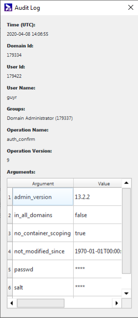 | Groups | List of the Groups to which the User doing the operation belongs at the time of the operation. Each group is represented by its ID and its name. |
