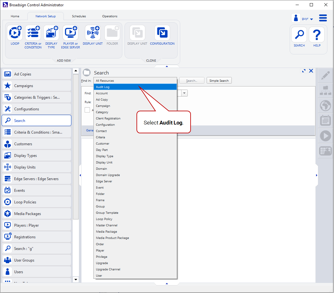 - Click the magnifying glass icon at the top-right of Broadsign Control Administrator.