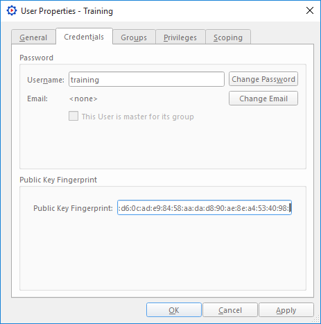 - The public key fingerprint is assigned to the user you created, thereby allowing Broadsign Server to authenticate the user and assign the correct security context.