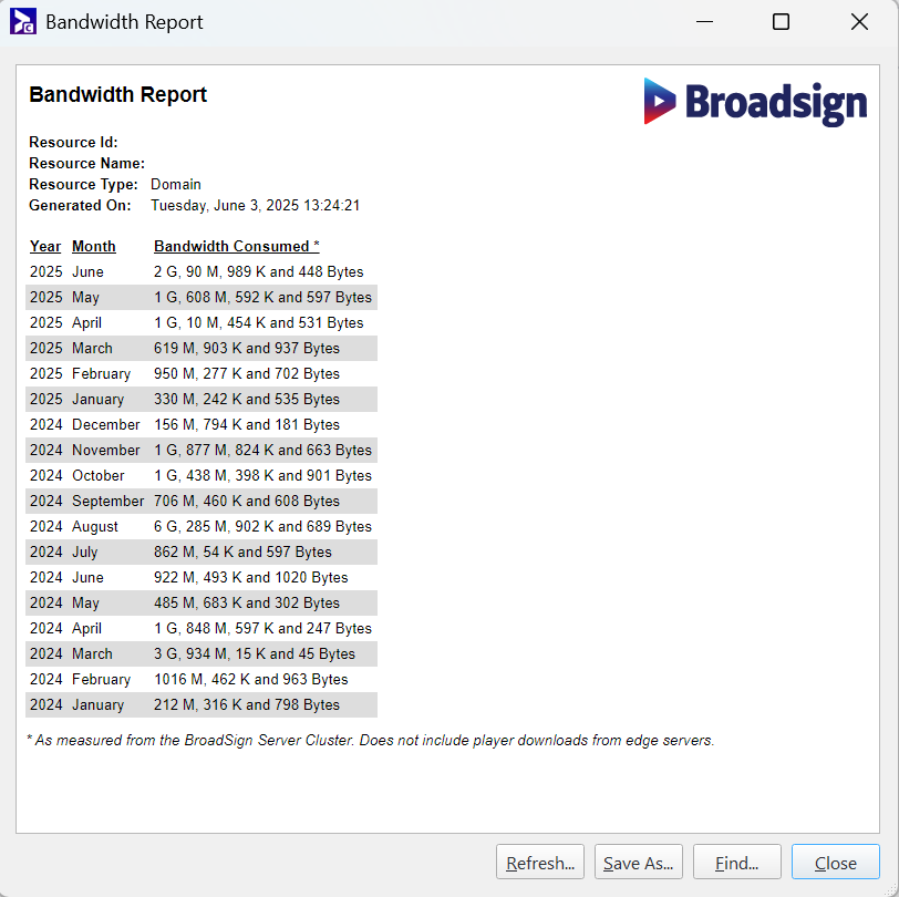 The Bandwidth Report lists the amount of network bandwidth consumed by the network, or by a single resource within it, on a monthly basis.