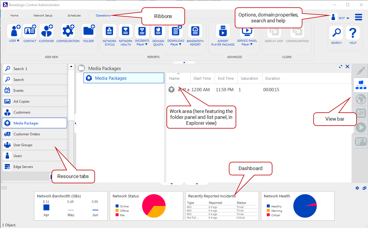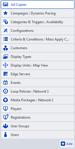Broadsign Control Administrator’s workspace is flexible, and centers around the work area.