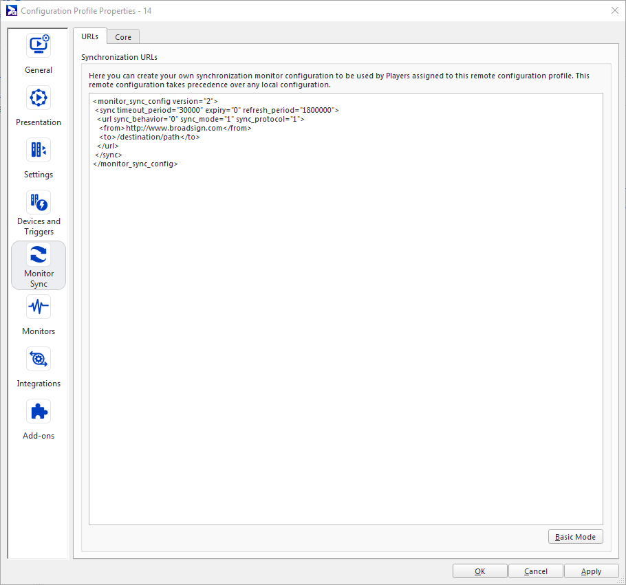 - In the Configuration Profile Properties of a player, go to Monitor Sync > URLs.
