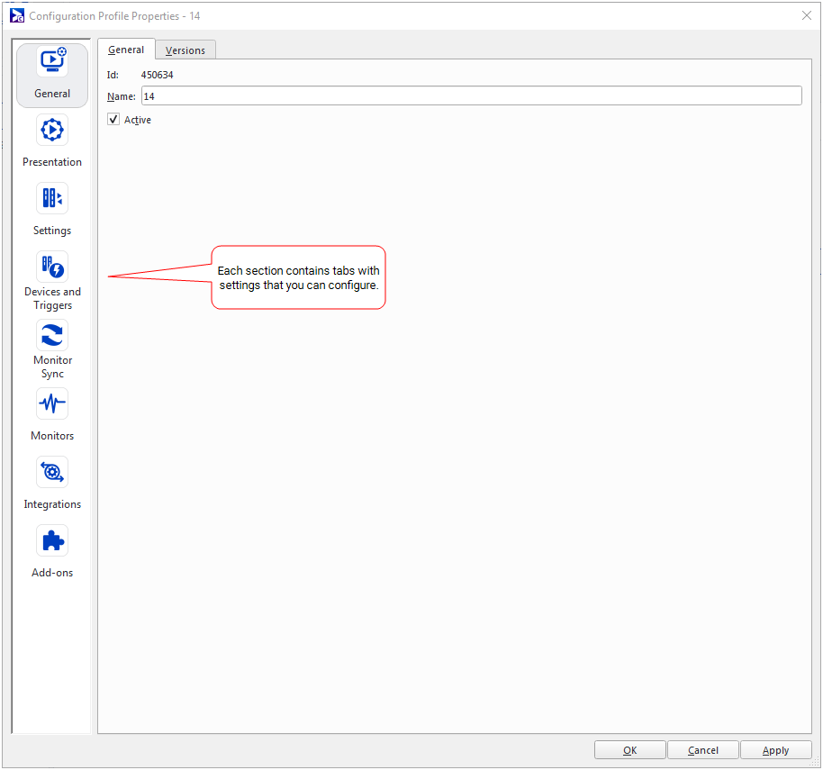 - The Presentation Section: Applying exclusively to player configuration profiles, the settings in this section control the behaviours of the various media products used to display content on-screen.