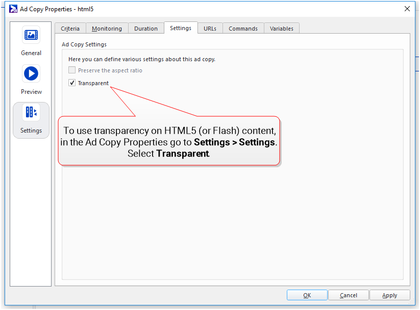 Note: The "Transparency" option will appear greyed-out unless you are editing an HTML ad copy (HTML and HTML packages).