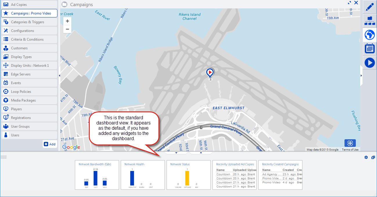 Broadsign Control Administrator's workspace is flexible, and centers around the work area (see Work Area).