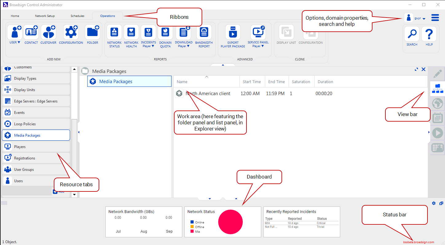 Touring the Broadsign Control Administrator Workspace – Outlines how to log in to Broadsign Control Administrator. Then describes the six main areas of its interface: the work area; the resource tabs; the ribbons; the view bar; the search/help icons and menus; and the dashboard.