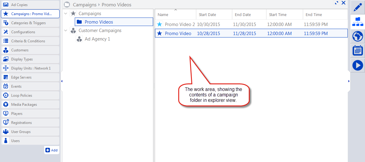 You can access both the folder panel and list panel (in explorer view), for any of Broadsign Control Administrator's resources, for example ad copies.