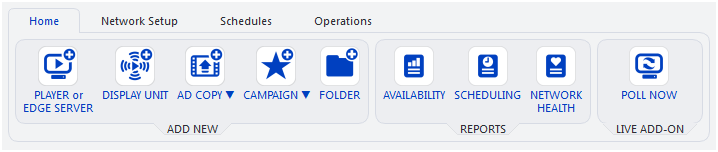 The Ribbons organize tasks by the role of the user: Network Setup (see Network Setup Tutorial), Schedules (see Content and Scheduling Tutorial) or Operations (see Network Operations Tutorial). When you click on one of these choices, a ribbon of options relating to that role appear. Any selections made in the ribbon appear in the work area.