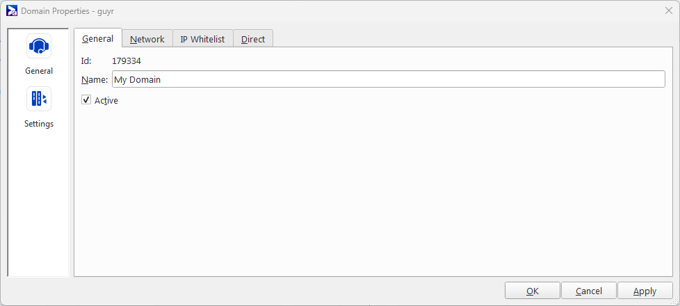 - General – Here you can see the Domain ID and name, and the option to make the domain active or inactive.