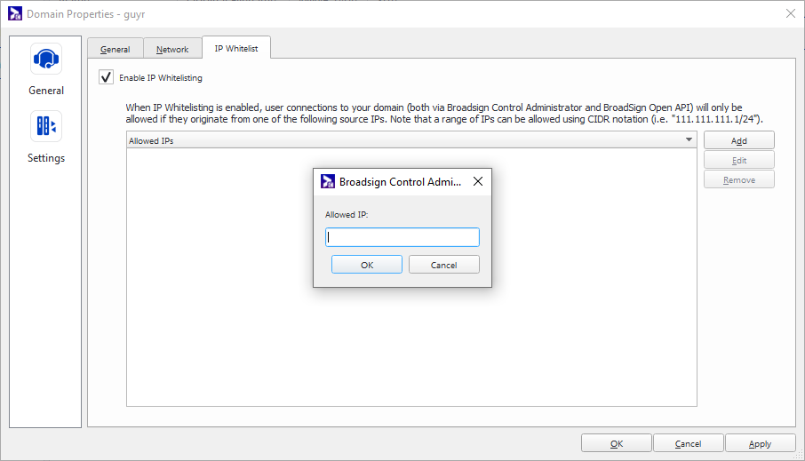 - IP Whitelist – If you enable this feature, only users (see Users) that connect from the IP addresses you provide will be able to log on to Broadsign Control Administrator or call Broadsign Control API.