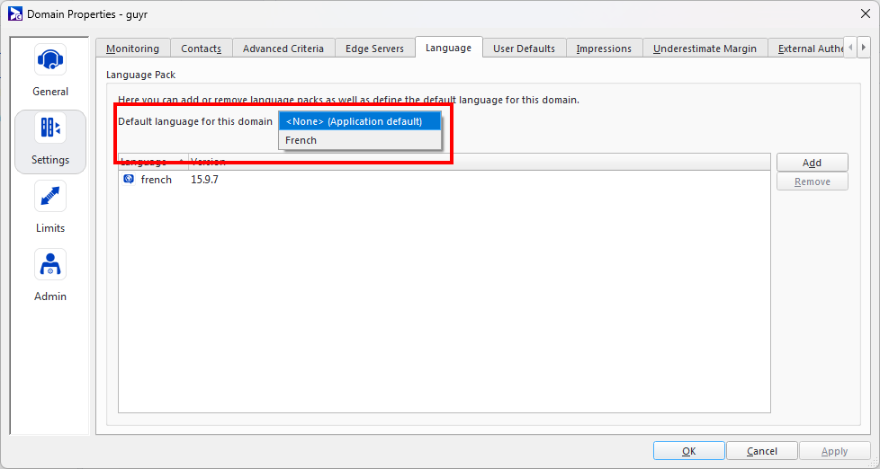 Here you can add or remove language packs, as well as define the default language for the domain.