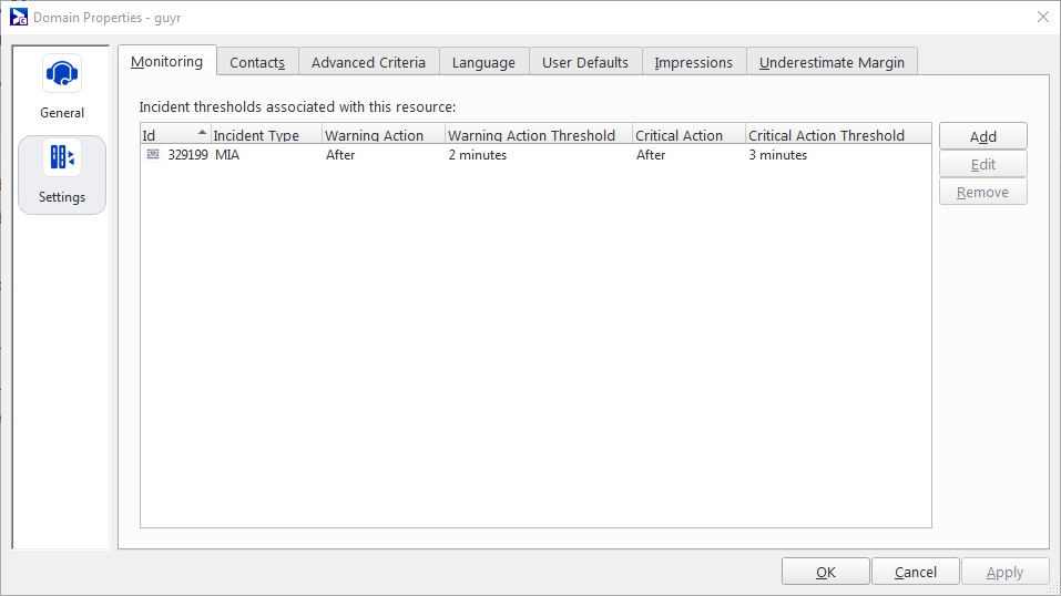 Here you specify the incident thresholds associated with the domain. For more information, see Incident Thresholds.