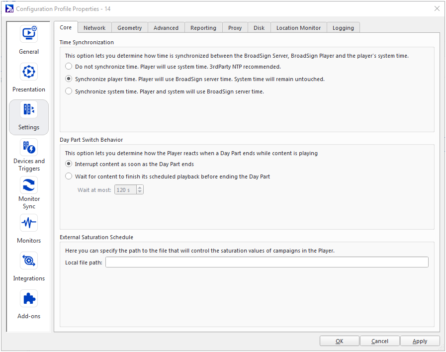 If your administrator has enabled your domain to utilize automatic external saturation configuration for players on Broadsign Direct, you won't need to specify a path. When this option is enabled on a domain that uses Broadsign Direct, players with version 15.0.0 and later, the players will be automatically configured to download their external saturation schedules from Broadsign Direct.