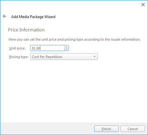 Price Information – Set the unit price (monetary value per unit) and pricing type (cost per repetition, screen, or thousand impressions; or fixed cost).