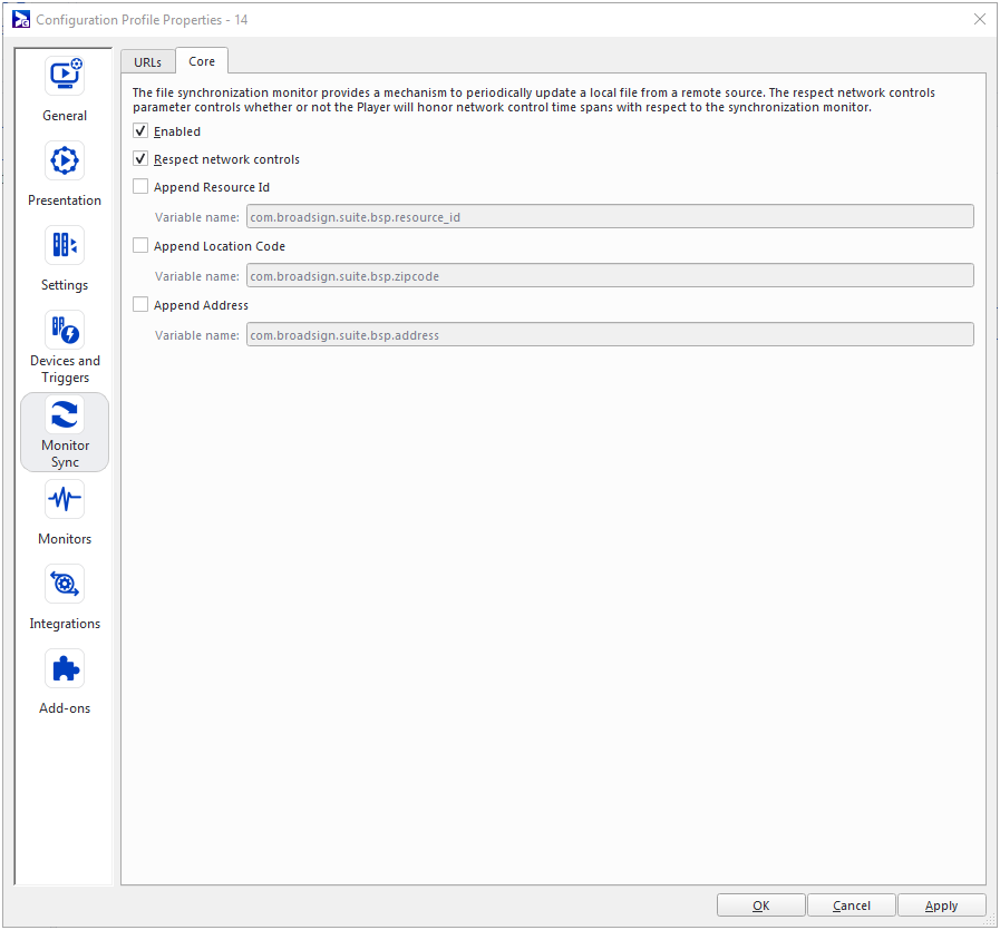 | Respect network controls | Controls whether the player will honor Network Control time spans with respect to the file synchronization feature. See Network Control. |