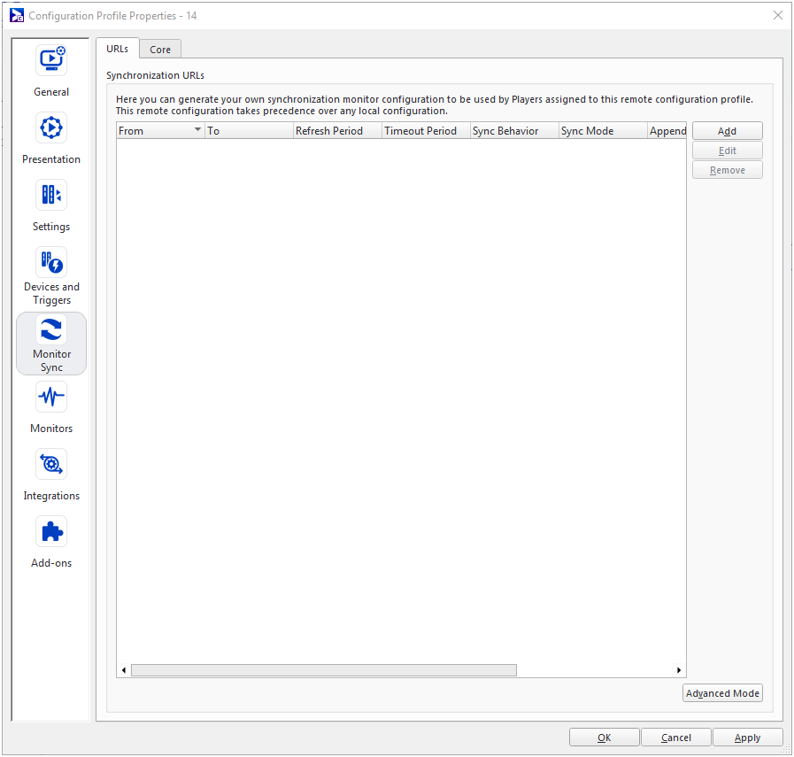 - URLs – Allows you to configure which files to synchronize. For an in-depth tutorial, see Synchronization Monitor.