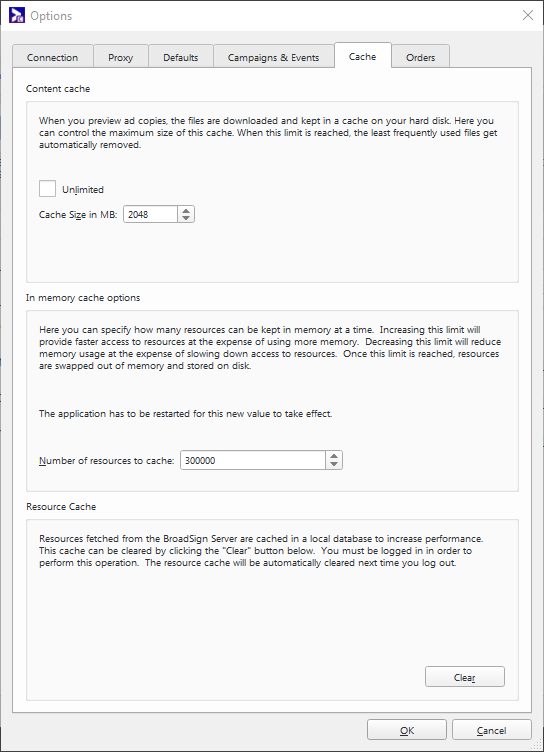 - Resource cache – If Broadsign Control Administrator fetches resources from Broadsign Server, it caches them in a local database to increase performance. You can clear this cache by clicking the Clear button.
