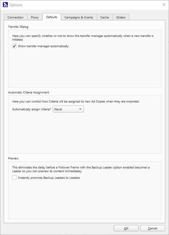 The options in the Defaults tab affect the process of importing ad copies (see Ad Copies).