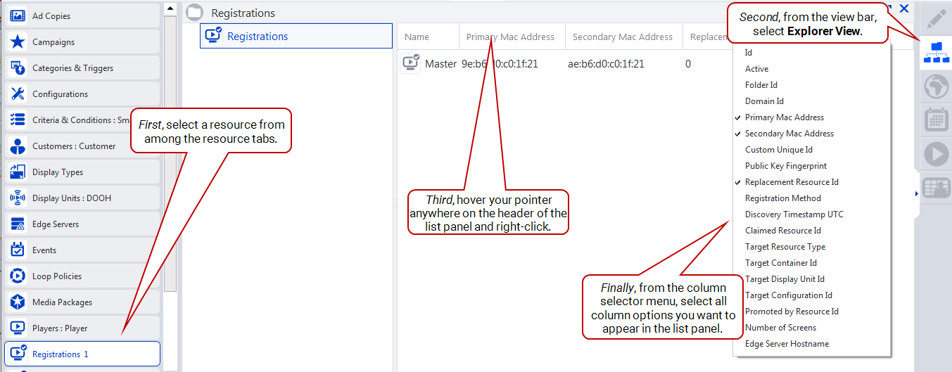 From the resource tabs on the left, select Registrations. Then, right-click anywhere in the work area. From the contextual menu, select Add Registration.