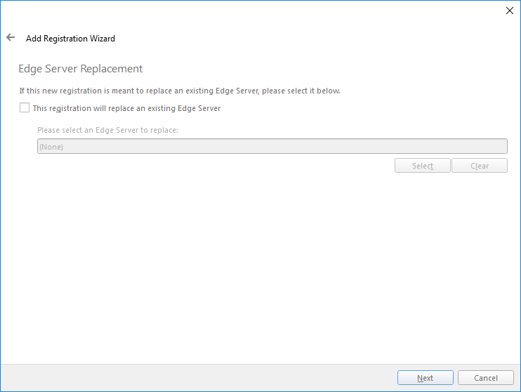 Note: If you select This registration will replace an existing Edge Server, you will not be able to advance in the wizard until you make a selection. Otherwise, this page is optional.