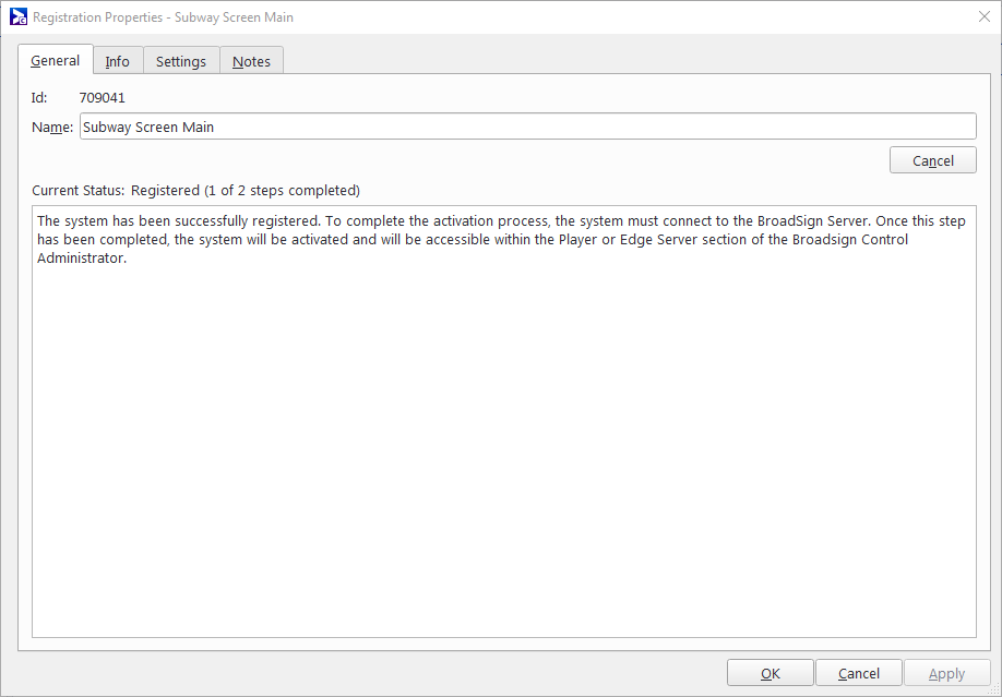 Registering a new player or edge server is a three-step process. The status of your registration can be consulted at any time by viewing the General tab in the Registration Properties dialog. The registration process proceeds as follows: