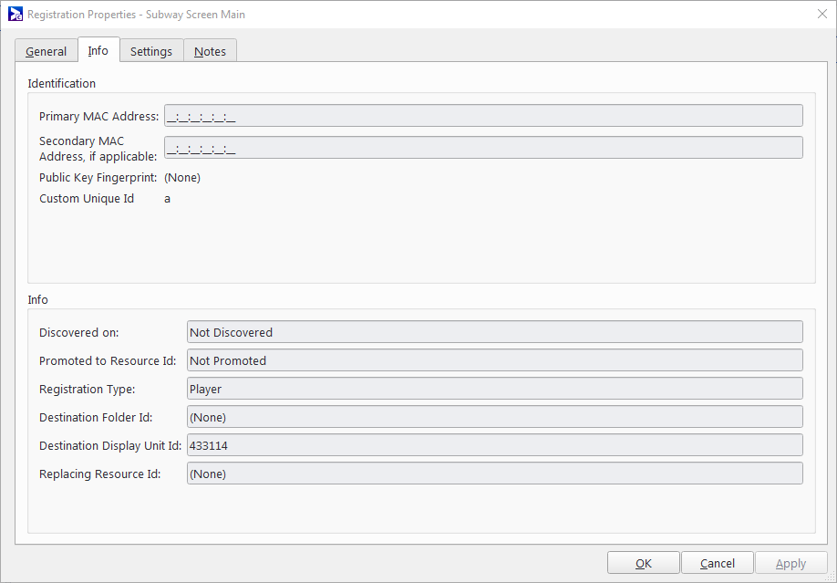 - Replacing Resource Id – ID of the Player or Edge Server that the selected registration is replacing.