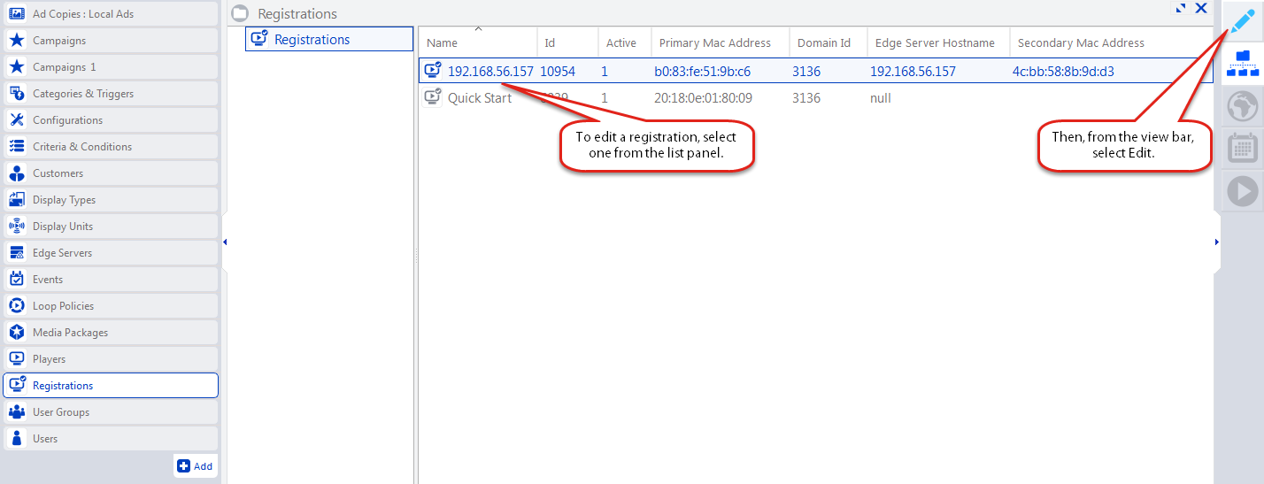 From the list panel, select a player or edge server registration. Then, from the view bar, select Edit.
