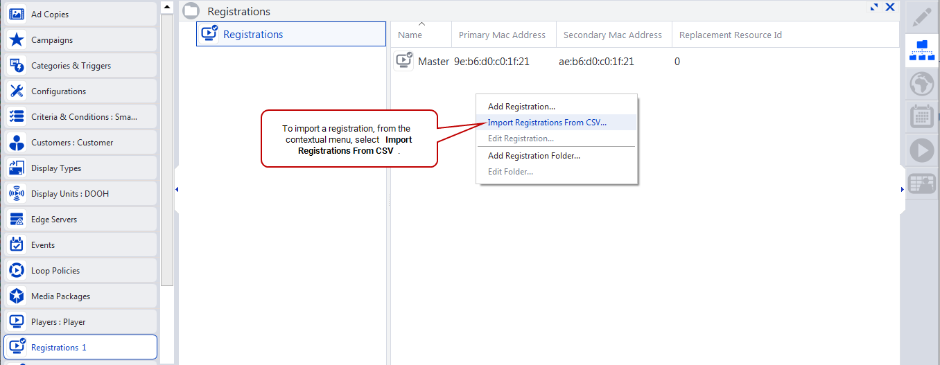 To open the Import Client Registration Wizard, from the resource tabs on the left, select Registrations. Then, right-click anywhere in the work area. From the contextual menu, select Import Registrations from CSV.