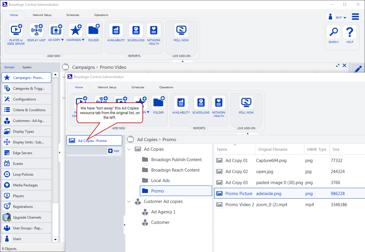Tear Away – If you click and drag a resource from the tabs panel, you can tear it away, and open it in a new window. You would then have two open Broadsign Control Administrator windows.
