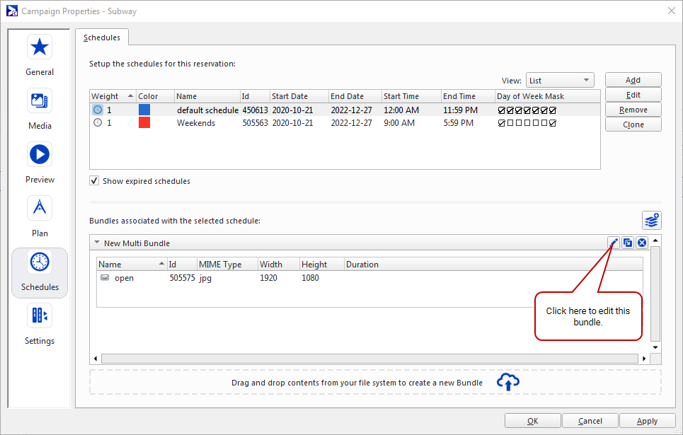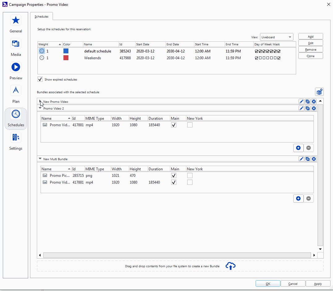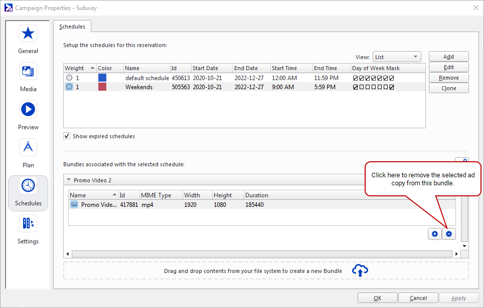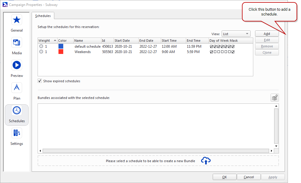 New Campaigns will automatically have a default Schedule assigned to them that covers the time range specified in the Reservation Wizard. If multiple Schedules are required within a campaign, they can be added via the Campaign Properties window. The Schedules themselves contain Ad Copies, which they iterate through and tell Broadsign Control Player to display when their turn comes. For more information on how Schedules are used to build the playlist, see Playlist Generation.