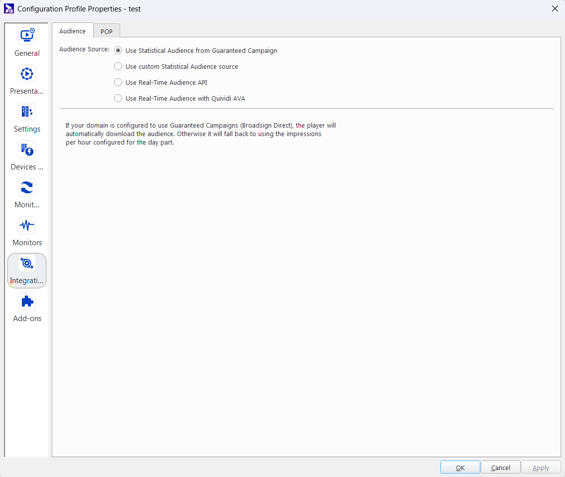 - Open the Configuration Profile Properties, and go to Integrations > Audience (see The Audience Tab).
