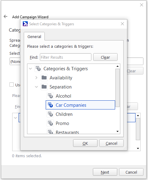 Example: Imagine that we have two campaigns for two different car companies. We don't want these campaigns to play back to back in the loop, so we will assign a separation category to them.