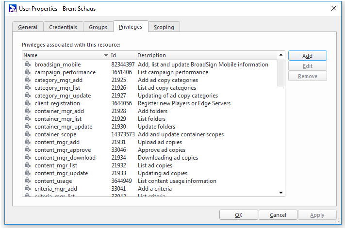 Also, you can add, edit or remove privileges (if you, yourself, have adequate privileges). A description accompanies each privilege.