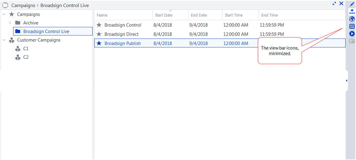 Minimize/Expand – If you minimize the view bar, freeing up more space in the work area, Broadsign Control Administrator minimizes the icons.