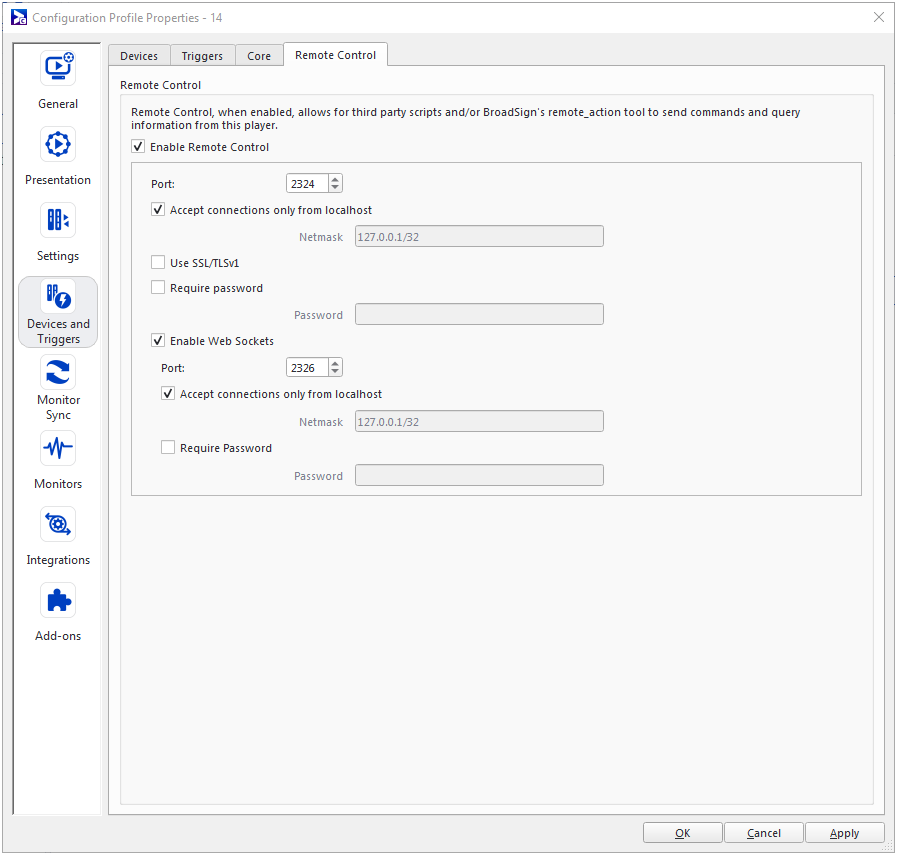 - Port – Pour l’outil remote_action, utilisez le port 2324. Pour plus d'informations, voir Broadsign Control Player API - Aperçu.