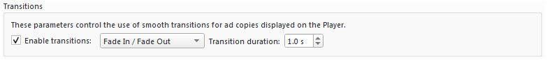 Vous pouvez contrôler l'utilisation des transitions fluides entre les copies publicitaires image ou vidéo consécutives affichées sur le lecteur.