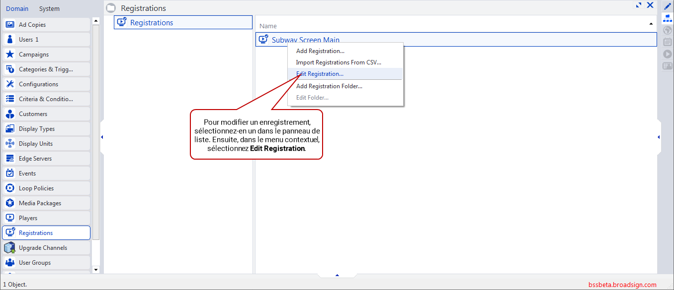 Dans le panneau de liste, cliquez avec le bouton droit sur l'enregistrement d'un lecteur ou d'un serveur Edge. Ensuite, dans le menu contextuel, sélectionnez Edit Registration.