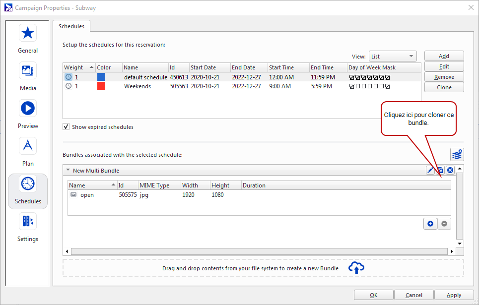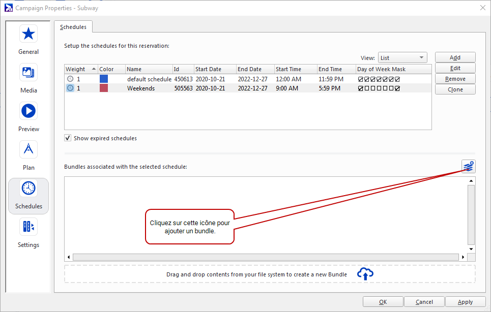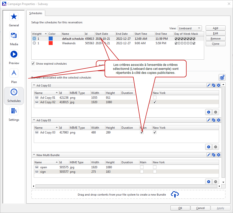 Sélectionne les copies publicitaires qui composeront l'horaire. Vous pouvez également sélectionner des bundles. Si l'horaire contient plusieurs bundles, il les affichera tous de manière uniforme.