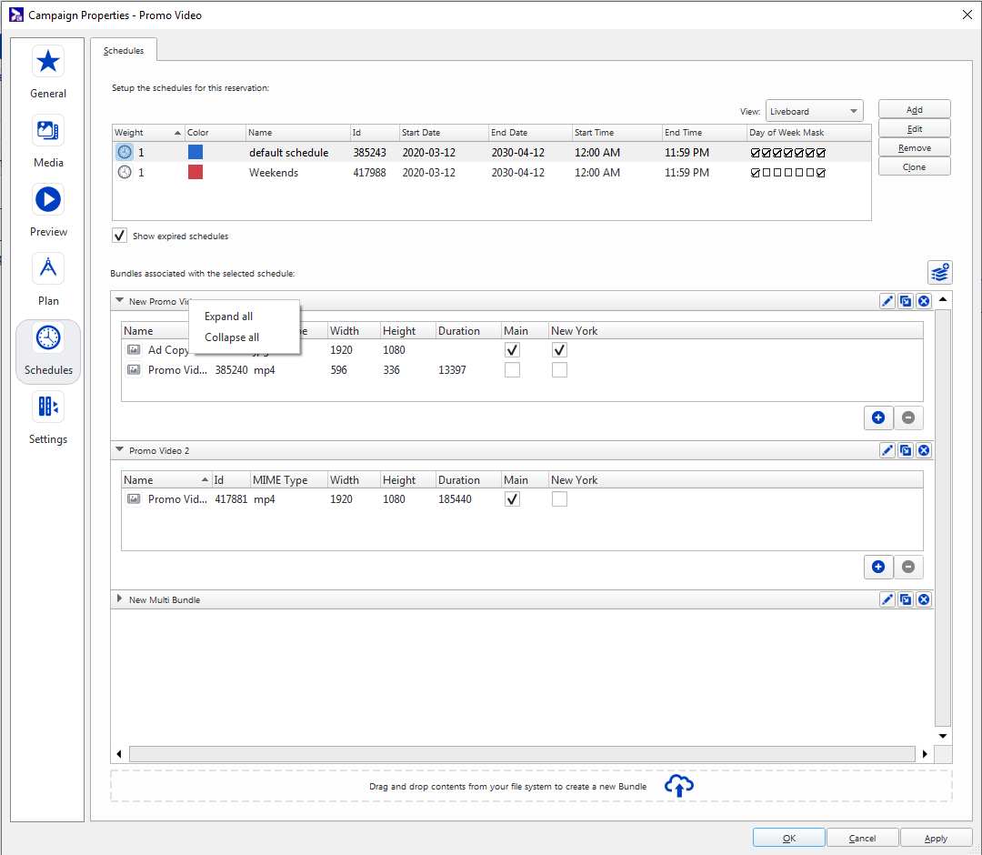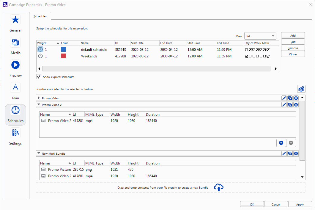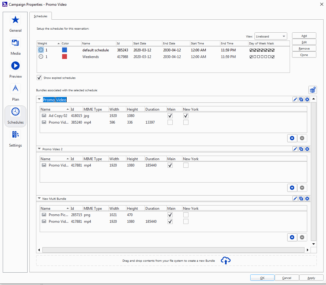 - Assigned Bundles – Sélectionne les copies publicitaires qui composeront l'horaire. Voir Ad Copy Selection.