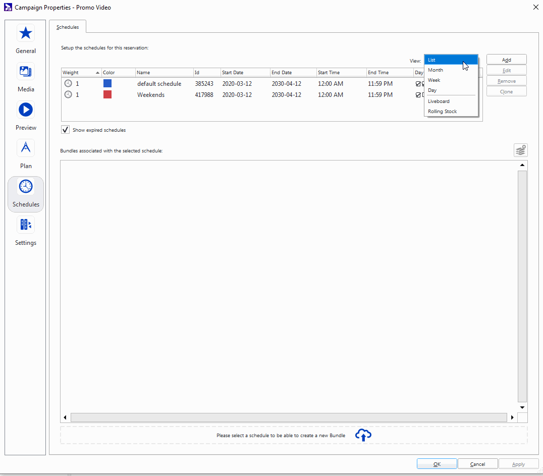 La vue Liste inclut les éléments de planification avancée, mais pas les cases à cocher d'association de critères. La sélection d'un horaire affiche les bundles et leurs copies publicitaires respectives associées à cet horaire. Pour plus d'informations, consultez Vue des bundles et des copies publicitaires.
