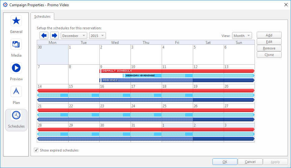Les nouvelles campagnes se verront automatiquement attribuer un horaire par défaut couvrant la période spécifiée dans l'assistant Reservation Wizard. Si plusieurs horaires sont nécessaires au sein d'une campagne, ils peuvent être ajoutés via la fenêtre Campaign Properties. Les horaires eux-mêmes contiennent des copies publicitaires, qu'ils parcourent et indiquent au Broadsign Control Player à afficher lorsque ce sera leur tour. Pour plus d'informations sur la façon dont les horaires sont utilisés pour créer la liste de lecture, consultez Génération de playlists.
