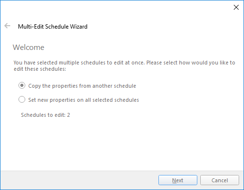 Set new properties on all selected schedules – Cela vous permet de définir de nouvelles valeurs pour certaines ou toutes les propriétés des horaires sélectionnés. Vous serez invité à sélectionner les propriétés à modifier et, en fonction de votre sélection, une série de pages d'assistant s'affichera, une pour chaque propriété sélectionnée.