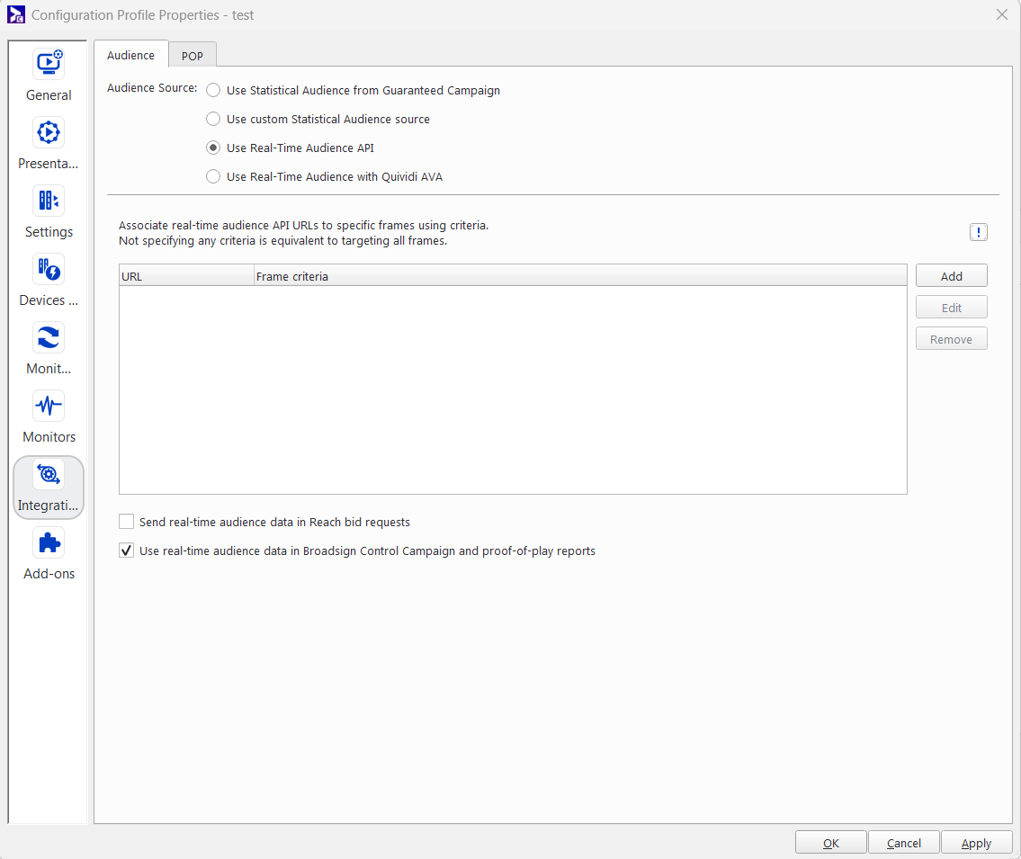 The Real-Time Audience API is an advanced feature of Broadsign Control Administrator.