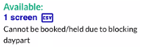 This scenario gives the number of selected screens that are available for the targeted period but cannot be booked or held because they have Blocking Day Parts (Temporary Out-of-Charge Screens).
